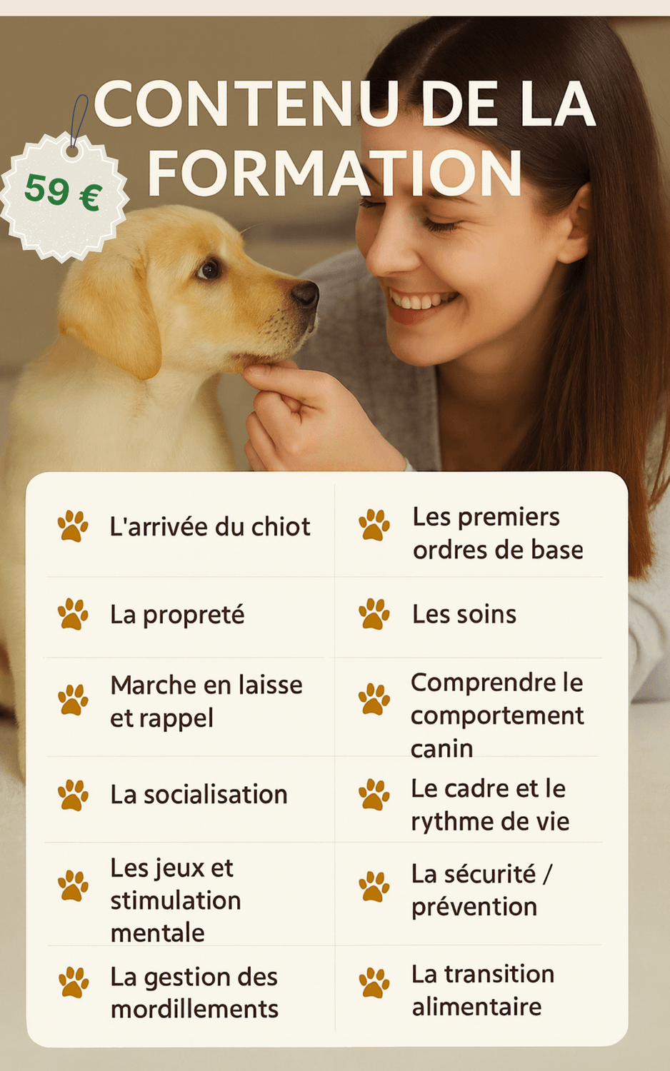 Apprenez à comprendre, éduquer et renforcer la relation avec votre chiot grâce à des modules vidéo clairs, accessibles à votre rythme.